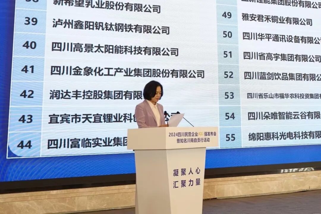 会上,唐燕发布了2024四川民营企业100强、制造业100强、服务业50强三个榜单以及调研分析报告。报告显示,2024四川民营企业100强,呈现出六大发展特征:经营规模稳步扩大、产业结构显著优化、转型升级持续深化、技术创新不断强化、国际进程企稳向好、社会贡献更加突出。她强调,每年定期“刷新”的“百强”榜单,既是一份荣誉,更是一份再接再厉、再上层楼的期待。百强企业要以自强,带动千强、万强,当好主力军、壮大生力军。广大民营企业要以百强企业为榜样,大力弘扬企业家精神,坚定信心,勇毅前行,跑出“加速度”,拼出“新业绩”,为建设现代化四川多挑大梁、多做贡献。